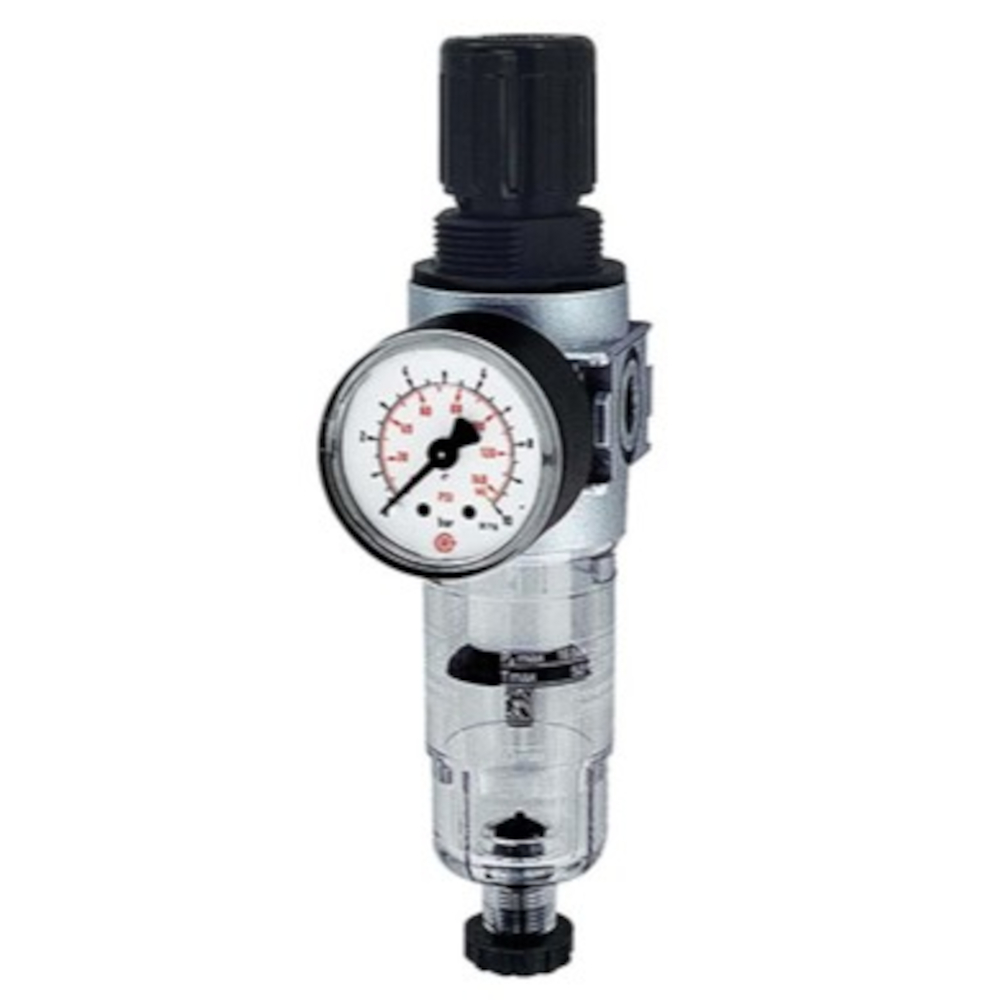 • The "multifix-mini" filter regulator is equipped with a polycarbonate tank and a pressure gauge.
