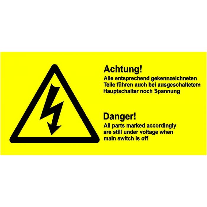 - Warning sign "Attention! All parts marked parts carry voltage even by switched off main switch" is applicable in the indoor and outdoor area